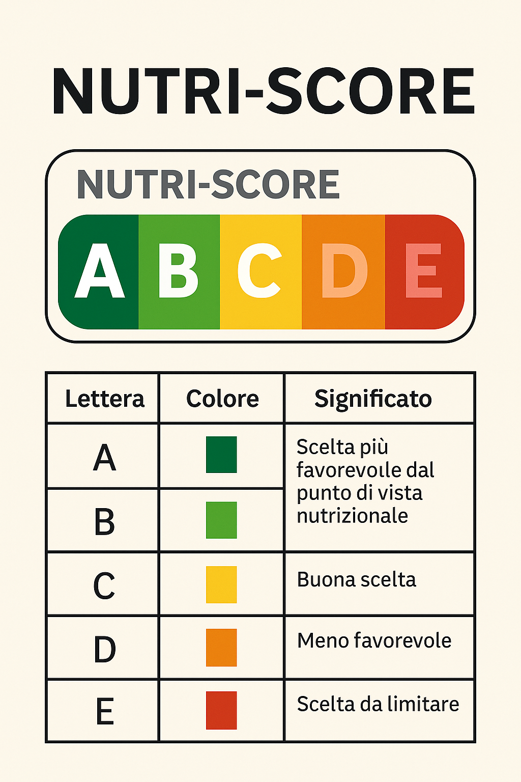 Utilizza una scala da A a E, abbinata a cinque colori che vanno dal verde scuro (A) al rosso (E). L’algoritmo valuta 100 g o 100 ml di prodotto, sommando punti negativi (calorie, zuccheri, grassi saturi, sodio) e punti positivi (fibre, proteine, frutta, verdura, legumi, frutta secca, oli di colza, oliva o noce).