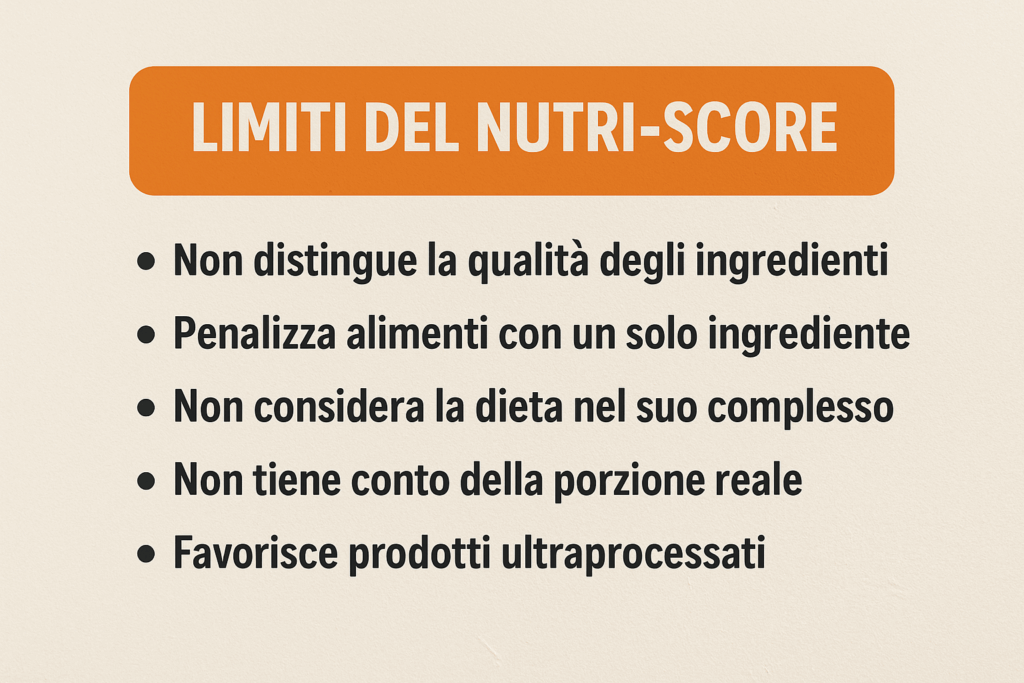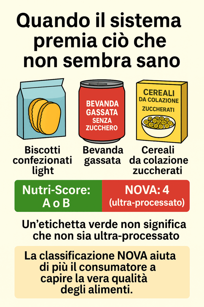 Alcuni alimenti industriali “riformulati” (light, arricchiti di fibre o proteine) ottengono punteggi migliori di cibi naturali, favorendo il marketing salutista.