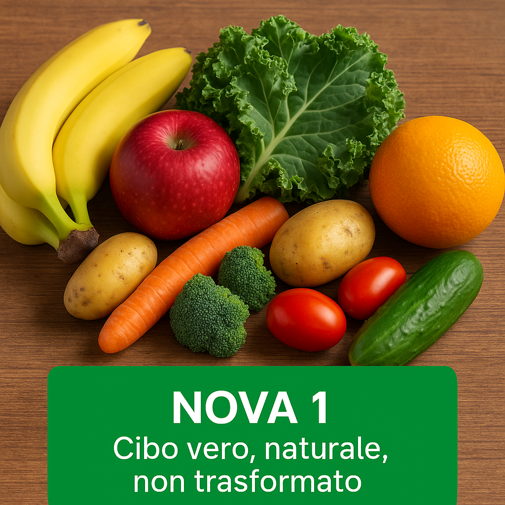 🟩 NOVA 1 — alimenti non o minimamente processati: frutta, verdura, legumi, cereali integrali, carne, pesce, uova, latte, acqua.