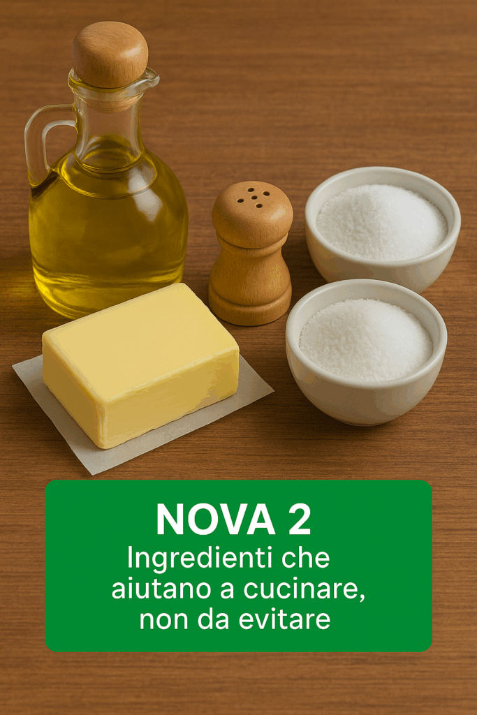 🟩 NOVA 2 — ingredienti culinari: olio d’oliva, burro, zucchero, sale. Da usare con equilibrio.