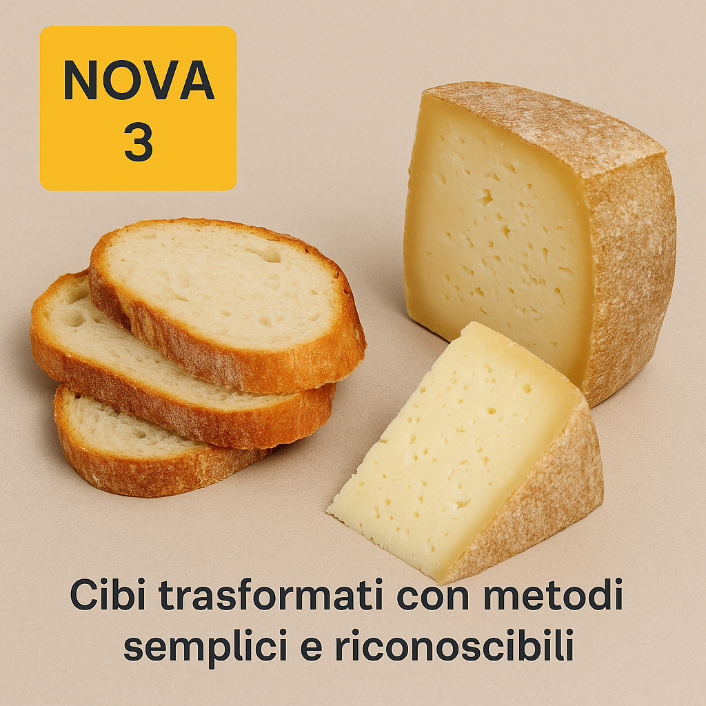 🟨 NOVA 3 — alimenti processati: pane, formaggi, conserve, prosciutto, tonno, vino. Ok se di buona qualità e con pochi ingredienti.