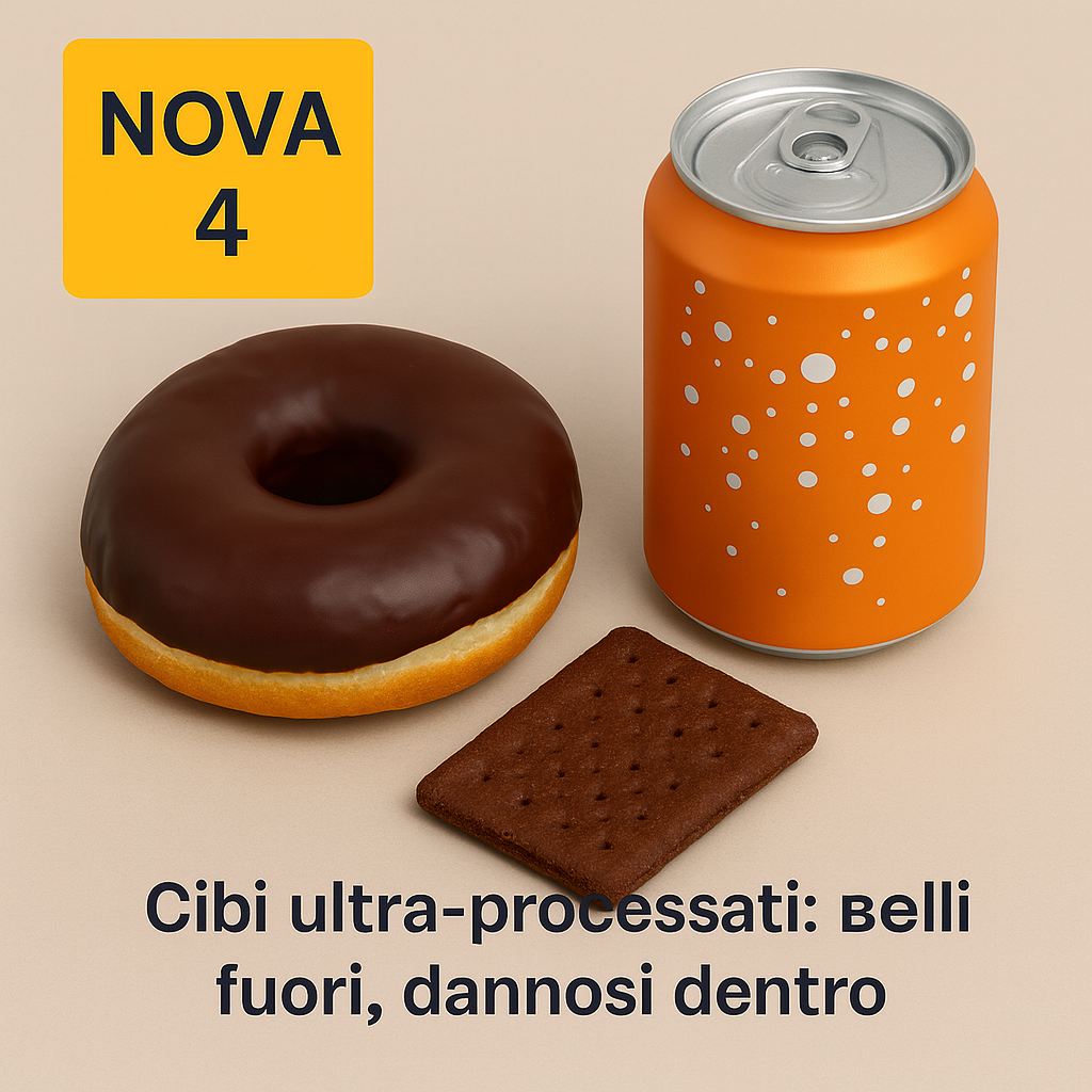 🟥 NOVA 4 — alimenti ultra-processati: snack, bevande zuccherate, cereali “fit”, dolci industriali. Da limitare.