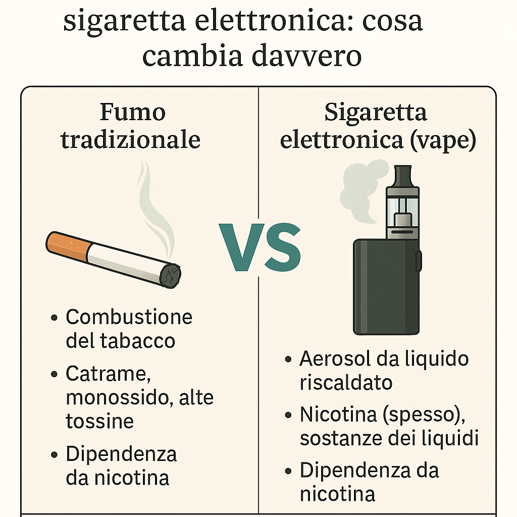 Molti pensano che la sigaretta elettronica sia “una versione light” del fumo. In realtà meno tossico ≠ innocuo. Qui trovi le differenze principali tra sigarette tradizionali ed elettroniche e cosa significa per la tua salute.