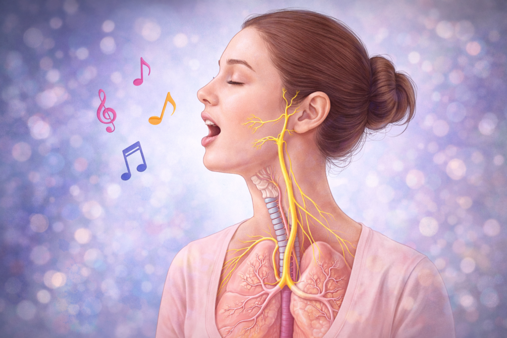 Il nervo vago è una specie di “centralina” che aiuta il corpo a passare dalla modalità allarme alla modalità recupero. E indovina? Cantare è uno dei modi più naturali per attivare questa transizione.